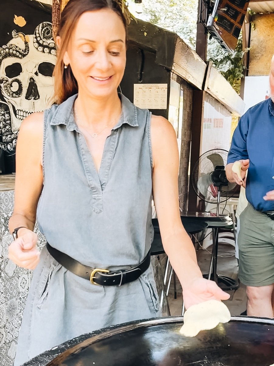 We mixed our own signature drink, the Mula Metatera (mezcal, ginger, mint, basil, lemon), and folded warm tortillas for quesadillas filled with huitlacoche. Plate after plate appeared: mackerel ceviche, battered Baja fish tacos and pork shank cooked carnitas-style. Dessert was a creamy flan that made the whole thing feel like a long lunch with friends.