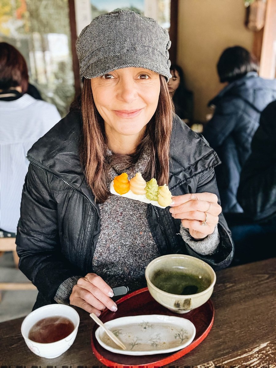 While there, we also stopped at Sankeien Saryo, a small teahouse by the Oike Pond, and it ended up being one of my favorite moments in the garden. We ordered skewers of chewy, hand-baked dango (a classic Japanese sweet made from rice flour) in seasonal flavors like pumpkin, chestnut, and sweet potato, along with matcha and roasted green tea.