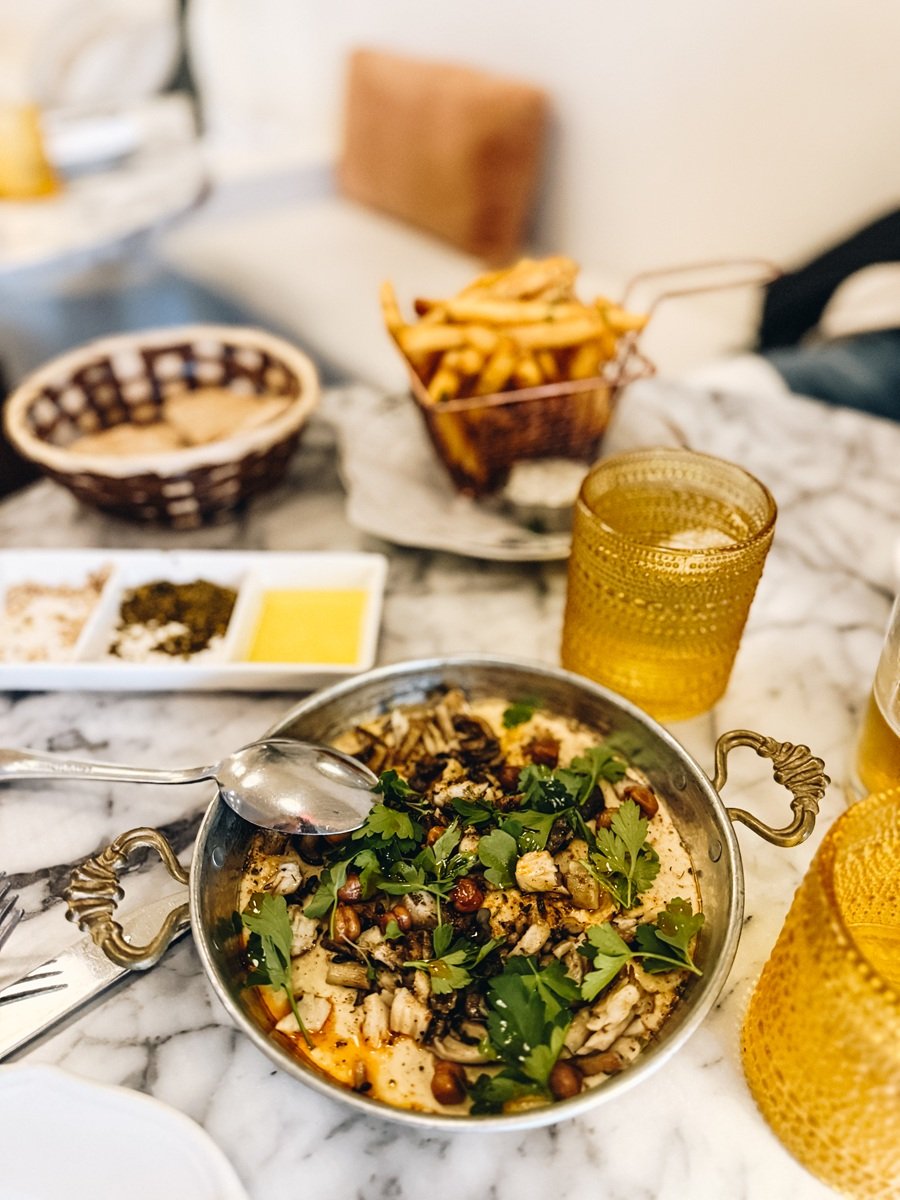 All that and the food is delicious too. We ordered the salmon skewer with Sultan’s pilaf filled with almonds and raisins, plus tzatziki and harissa on the side. We also shared roasted cauliflower with labneh and tahini and warm hummus topped with grilled oyster mushrooms and served with fresh pita. Everything was fresh, flavorful, and comforting without being heavy. It is the kind of meal that feels indulgent but still balanced.