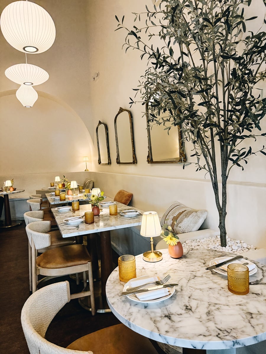 Then end your day at Troya Mediterranean Kitchen in the Cove Shopping Center. After 25 years running Troya restaurants in San Francisco, the Turkish born owners brought their warm hospitality to Tiburon and you can feel it the moment you walk in. The space is beautiful with plaster arches inspired by Turkish bazaars, curved banquettes, white oak, marble, brass accents, and soft lighting. It feels intimate but modern, but very cozy.